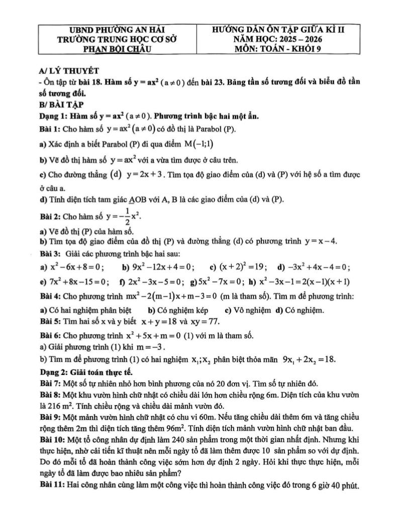 MonToan.com.vn giới thiệu đến quý thầy, cô giáo và các em học sinh đề cương hướng dẫn ôn tập giữa học kì 2 môn Toán 9 năm học 2025 – 2026 trường THCS Phan Bội Châu, phường An Hải, thành phố Đà Nẵng.