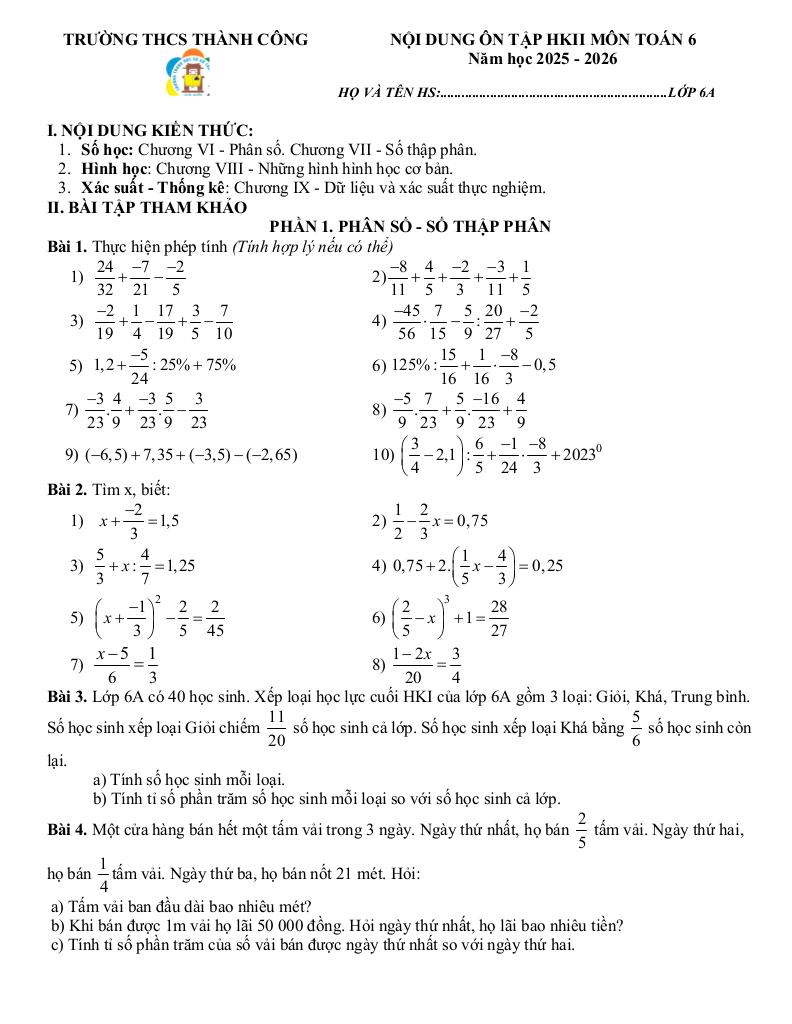 Quý thầy cô và học sinh đang tham khảo ôn tập học kỳ 2 toán 6 năm 2025 – 2026 trường thcs thành công – hà nội, bộ đề thi được xây dựng bám sát chuẩn toán math cập nhật nhất. Cấu trúc đề bảo đảm độ phủ kiến thức đồng đều, mức độ câu hỏi được cân chỉnh từ nhận biết đến vận dụng cao, phù hợp kiểm tra toàn diện năng lực. Hãy khai thác triệt để tài liệu này để đánh giá chính xác trình độ hiện tại và tối ưu chiến lược luyện thi của bạn.